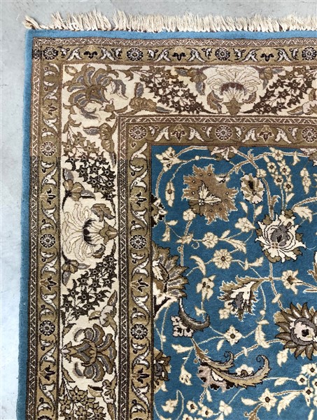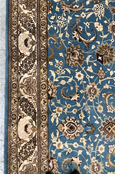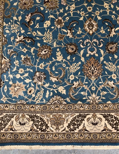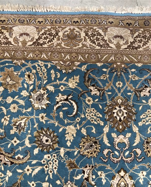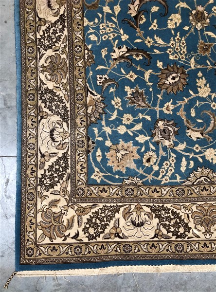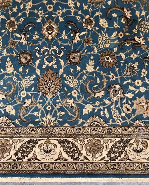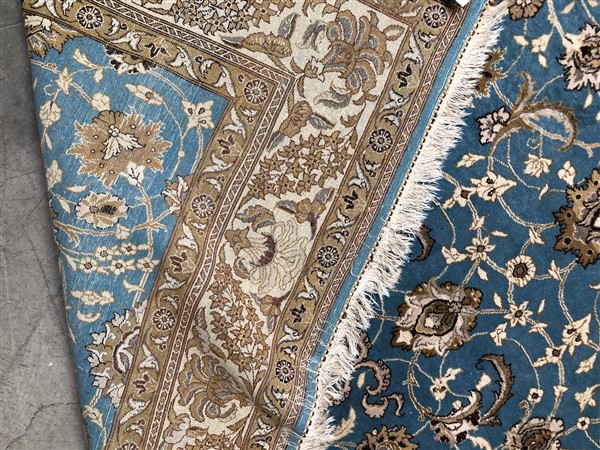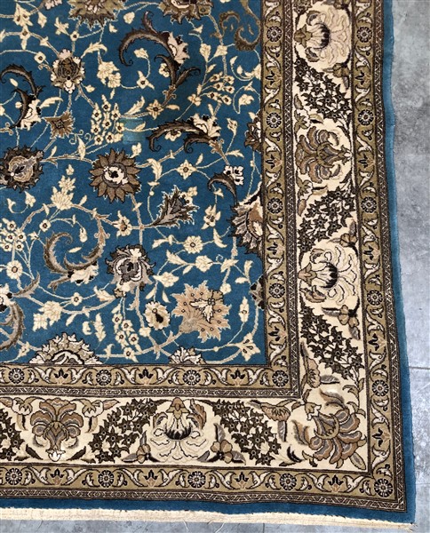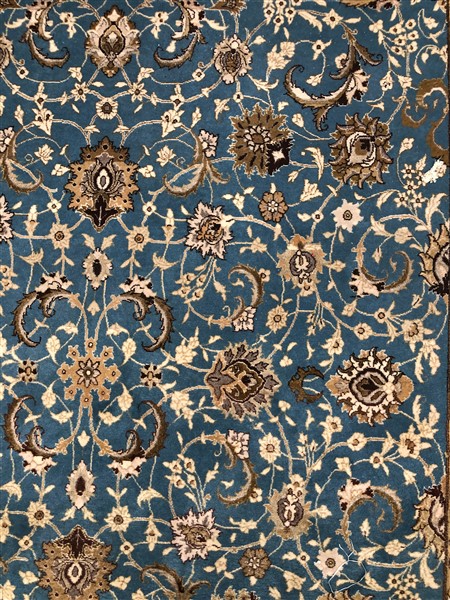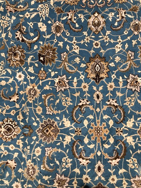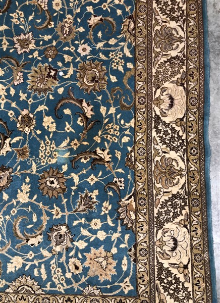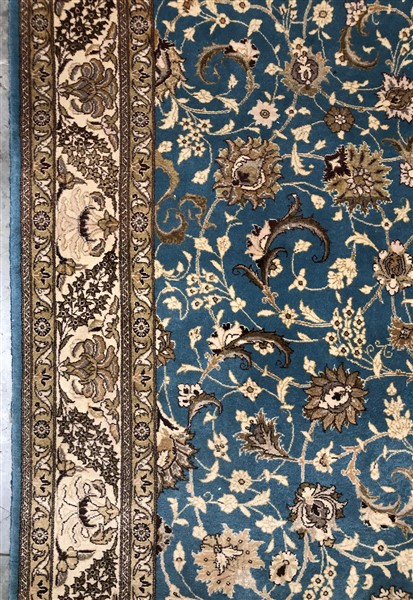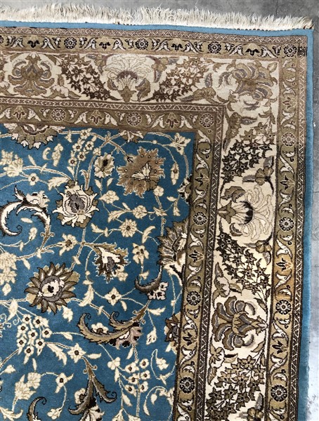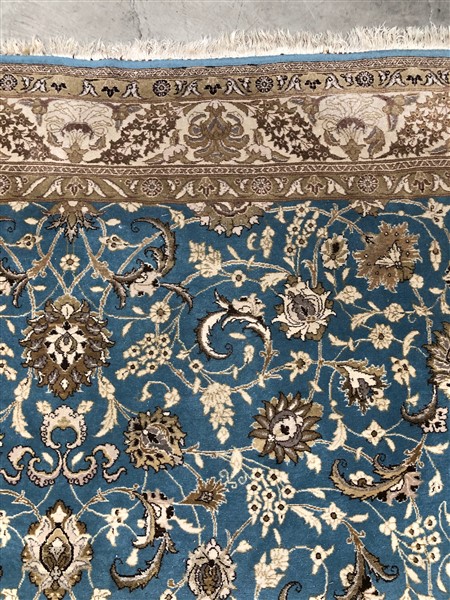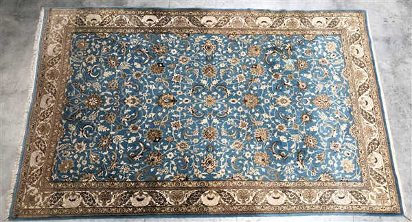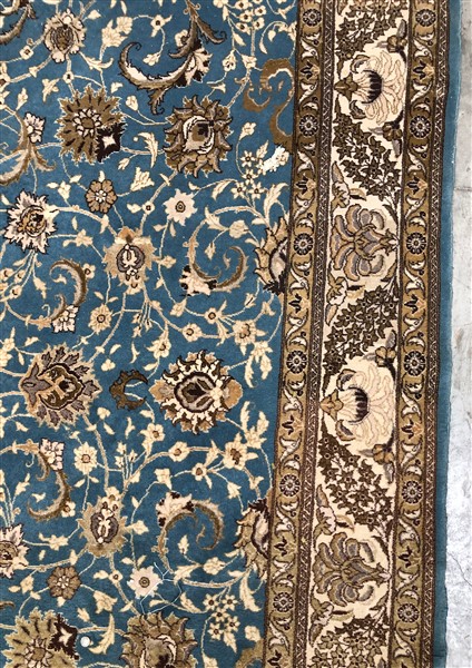 Tappeto Nain, Persia, secolo XX. Decoro all over con rami fioriti su fondo azzurro (cm 416x255) (difetti)