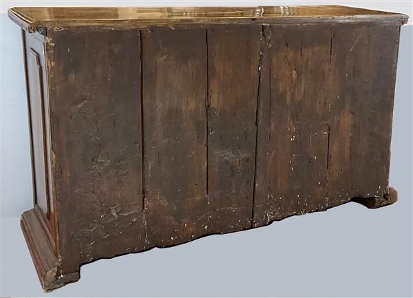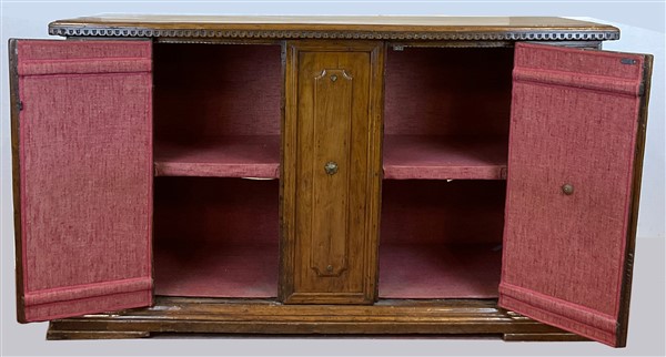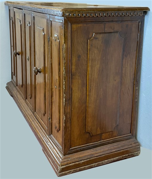 Antica credenza in noce con fronte a due ante e lesene pannellate, piano con bo
