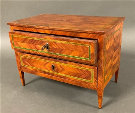 Modello di cassettone a due cassetti interamente intarsiato a marquetterie geometriche, fronte, piano e fianchi filettati in legno tinto verde (cm 33x23x19) (difetti)
