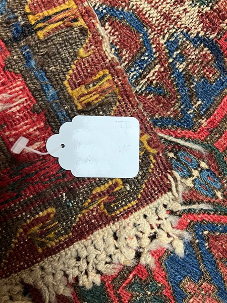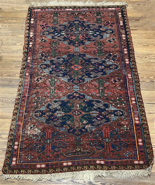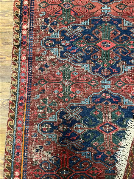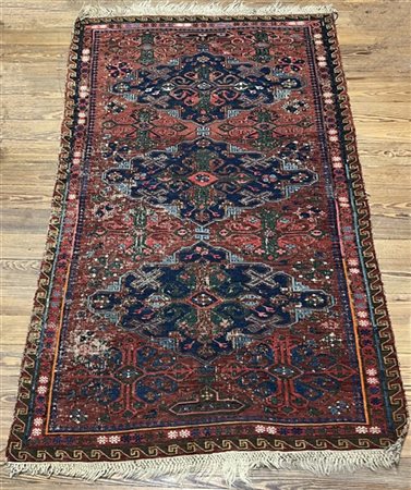 Tappeto Soumak, Caucaso, inizio secolo XX. Decoro con tre medaglioni romboidali nei toni del blu, azzurro e verde su fondo rosso scuro (cm 169x104) (difetti e rapature)