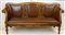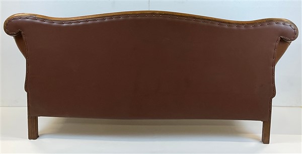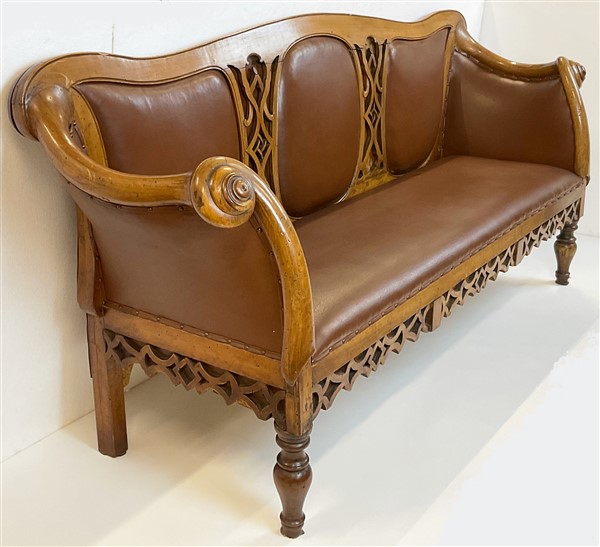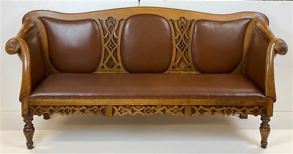 Divano a orecchioni in noce con schienale e grembiale intagliati e traforati a