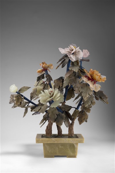 Composizione floreale in pietre dure con peonie, rose e crisantemi a guisa di alberello, rami rivestiti in tessuto. Cina, fine Dinastia Qing. (h cm 42) (difetti e mancanze)