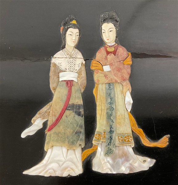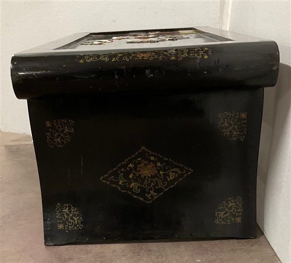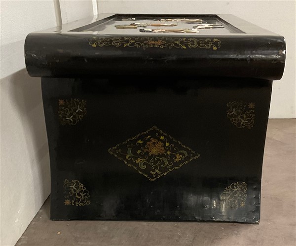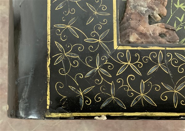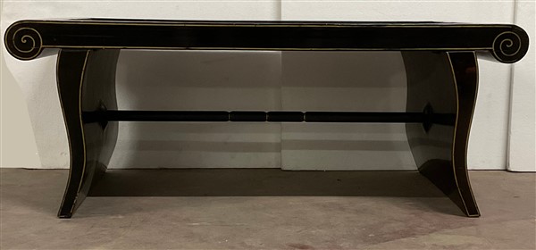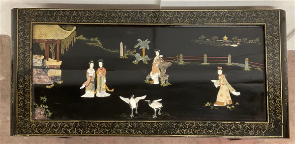 Tavolino da salotto in legno ebanizzato e dipinto, ripiano decorato in madreper