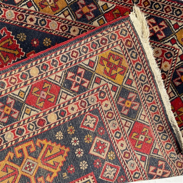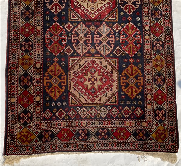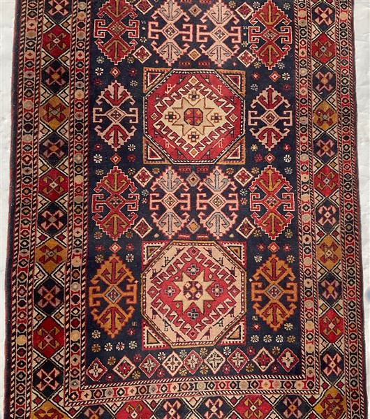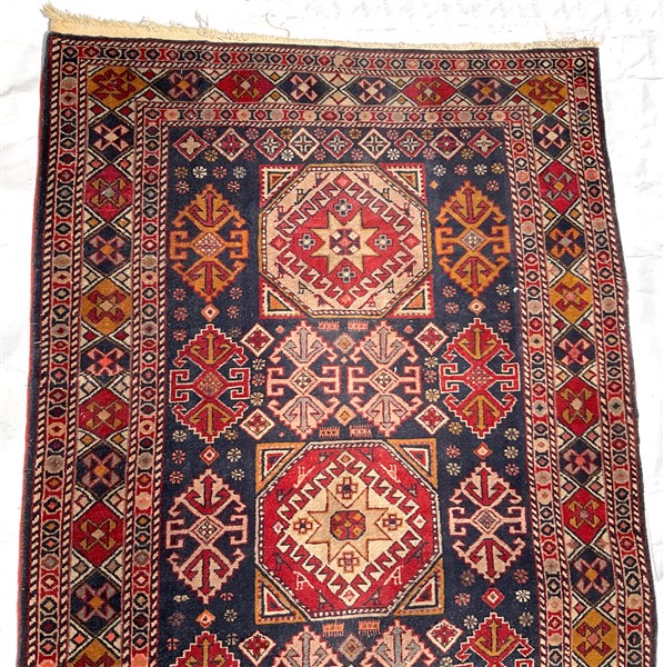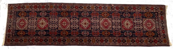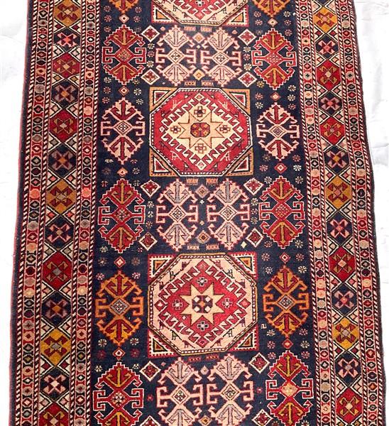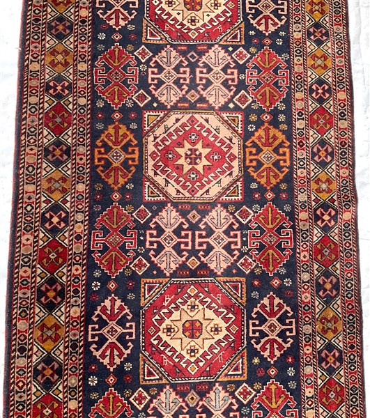 Tappeto passatoia, Caucaso, recente manifattura. Decoro con medaglioni stilizzati in policromia su fondo blu notte (cm 339x92) (lievi difetti)