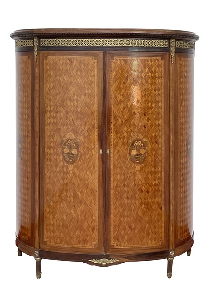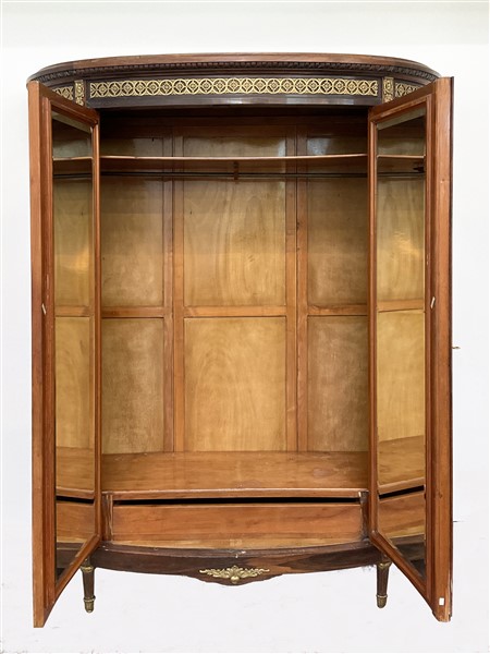 V. Valabrega, Torino, inizio secolo XX. Armadio a due ante lastronato, filettato e intarsiato in legni di varie essenze, fregi e applicazioni in bronzo. Etichetta del produttore interna (L. cm 184) (difetti)
