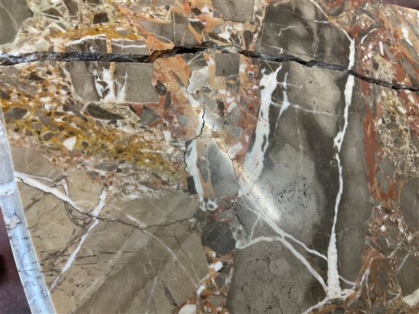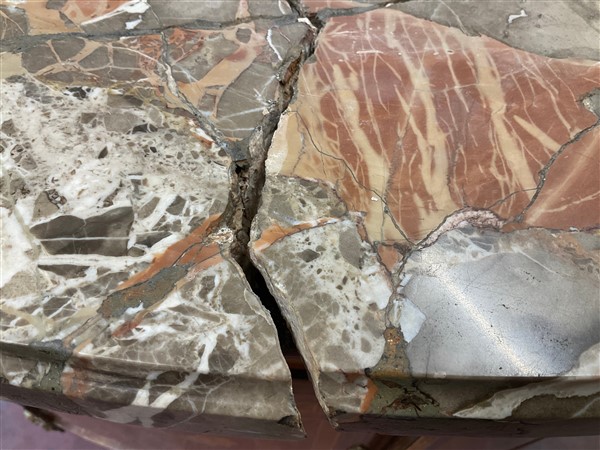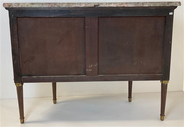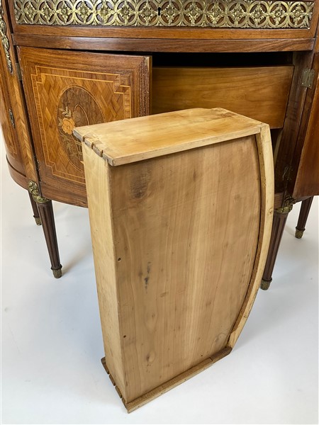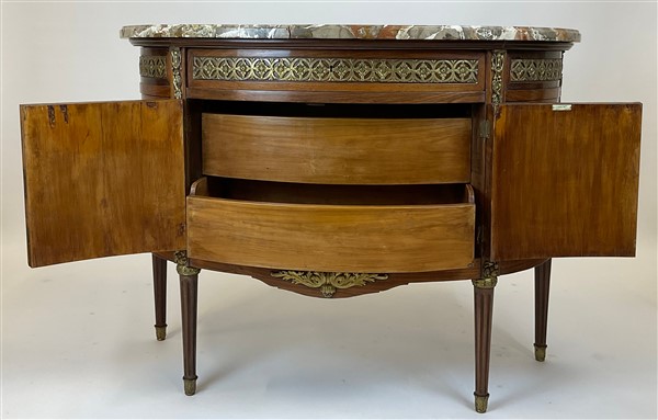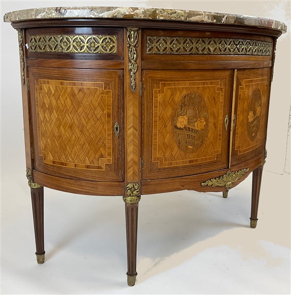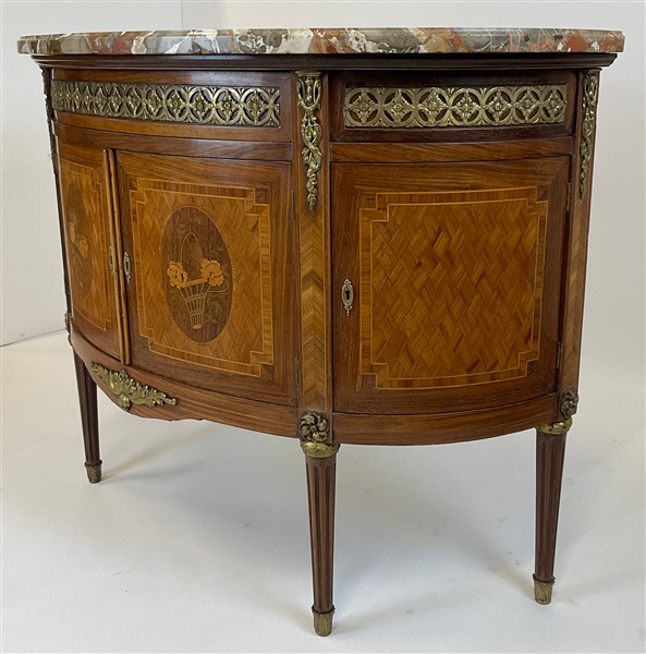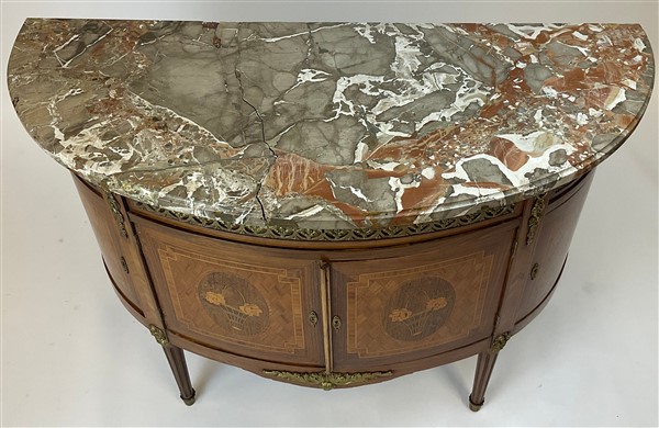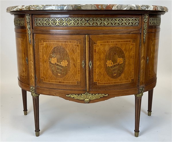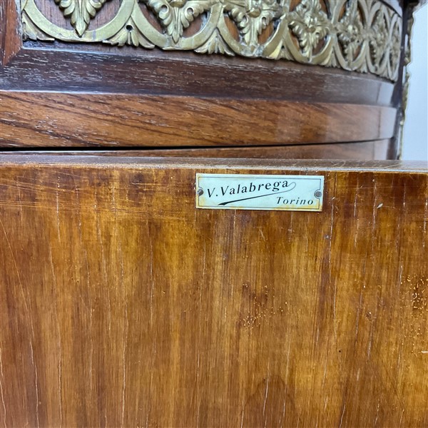 V. Valabrega, Torino, inizio secolo XX. Commode demi-lune a quattro ante ed un cassetto sottopiano lastronata, filettata ed intarsiata in legni vari, fregi e guarnizioni in bronzo, gambe scanalate e piano in marmo. Etichetta del produttore interna (cm 124x93x52) (difetti, rotture al marmo)