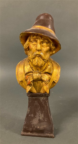 Scultore del secolo XIX, mezzo busto maschile con cappello, legno intagliato e