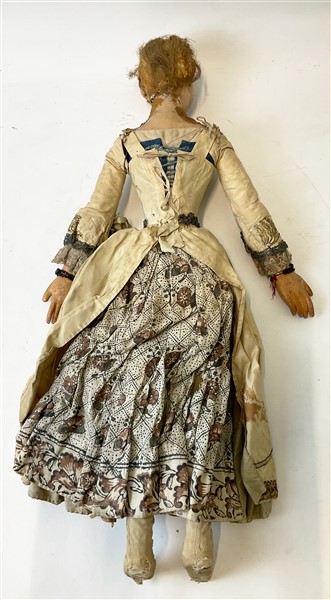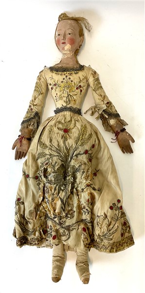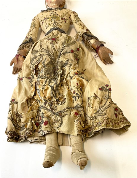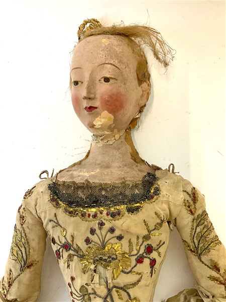 Manifattura nord europea del secolo XVIII. Bambola in materiali vari con volto e mani dipinti in policromia, vesti in parte coeve principalmente in seta con elementi in pizzo e filo dorato (h. cm 70) (difetti e mancanze)