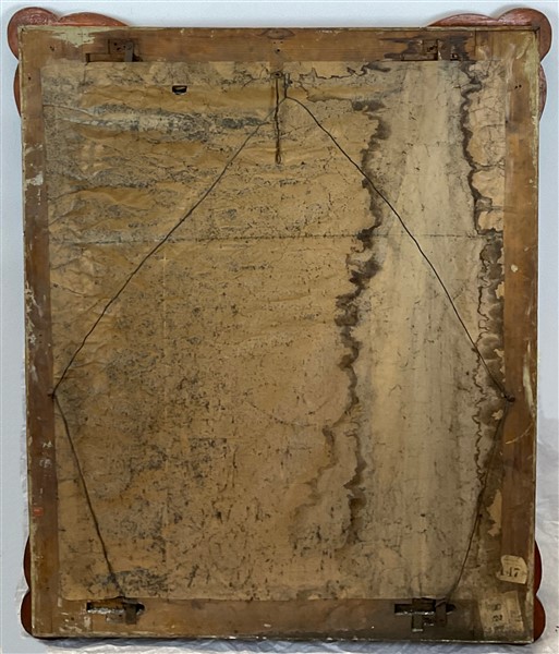 Specchiera con cornice in legno e stucco dipinto e dorato con angolari a palmet