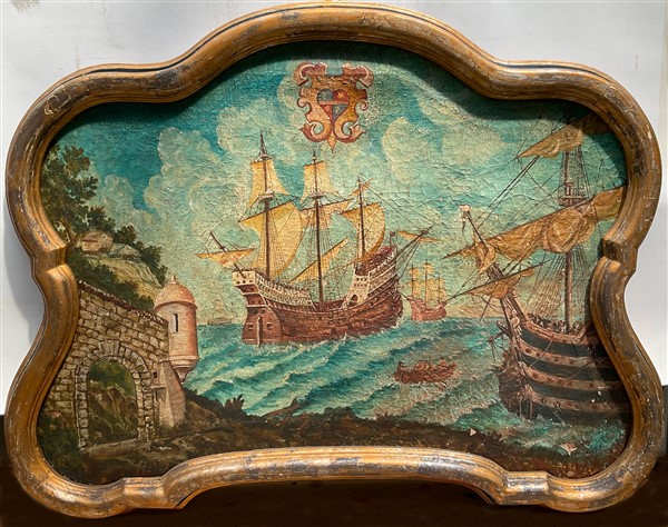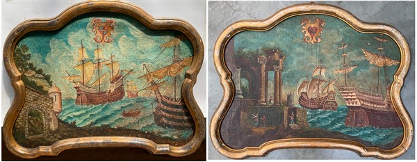 Ignoto "Marine con velieri" Coppia di antichi dipinti a olio su tela sagomat