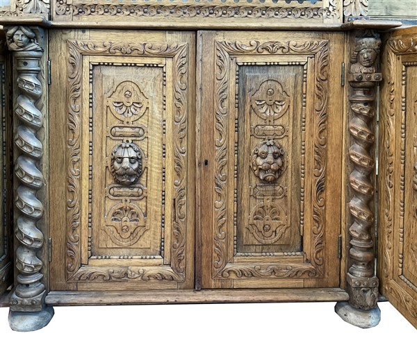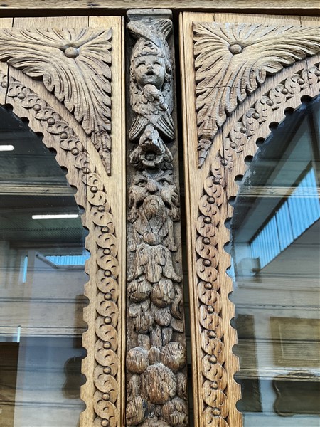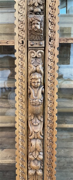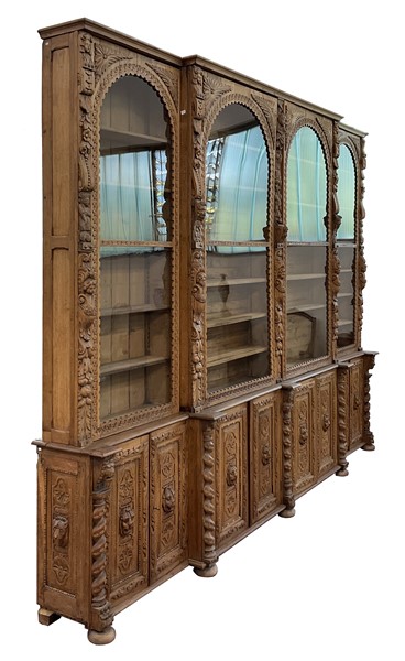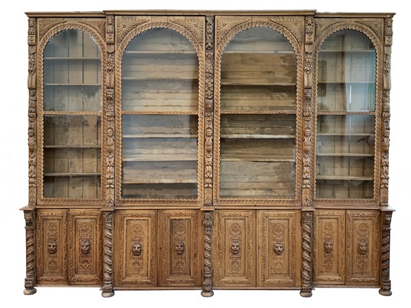 Libreria in rovere scolpito a due corpi con parte superiore a quattro ante a vetri intervallate da lesene con angeli, volute e figure zoomorfe a rilievo. Parte inferiore ad ante pannellate tra colonne a torciglione (cm 363x274x49) (difetti)