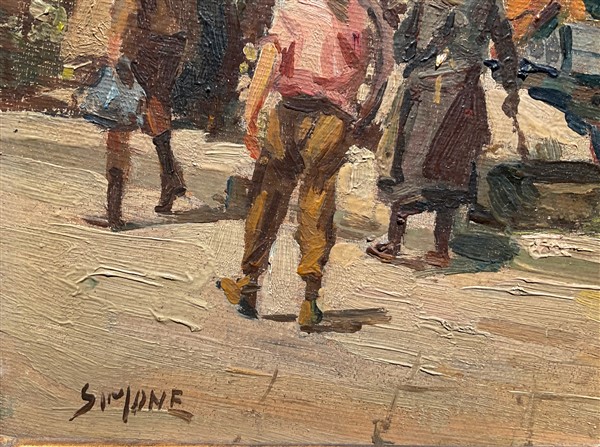 Ignoto del secolo XX "Scena di mercato" olio su cartone telato (cm 30x40) Fir