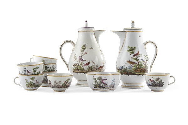 Manifattura di Ginori, Doccia, inizio secolo XIX. Lotto composto da due caffettiere, sette tazze e una zuccheriera (mancante di coperchio) in porcellana decorata in policromia a volatili entro paesaggio, profili in oro (h. max cm 20) (difetti, due coperchi non pertinenti, una tazza mancante dell'ansa)