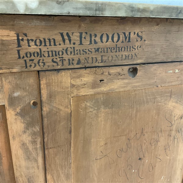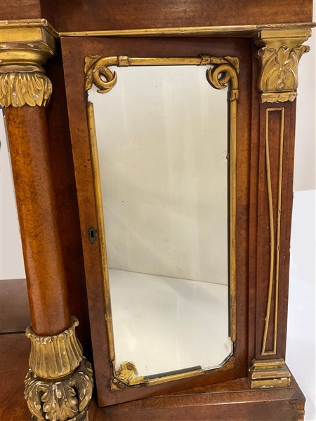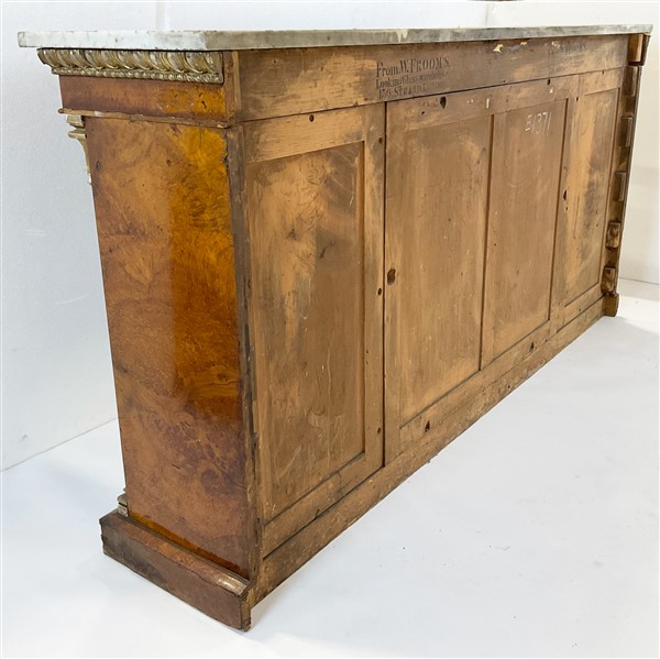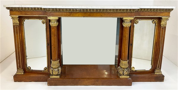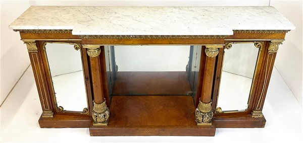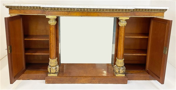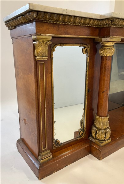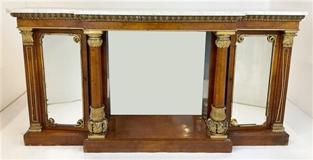 Servante in legni vari con fronte a due ante specchiate e vano a giorno, montanti a colonna, bordure e capitelli in legno intagliato e dorato, ciglio in bronzo dorato e piano in marmo bianco. Iscrizione al retro. Inghilterra, fine secolo XIX (cm 183,5x91x46) (difetti e rotture)