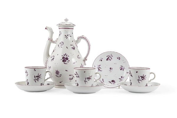 Manifattura Ginori, Doccia, fine secolo XVIII. Lotto composto da una caffettiera con coperchio e beccuccio zoomorfo, tre tazze e quattro piattini in porcellana decorata in porpora a fiori sparsi (h. max cm 24) (difetti, coperchio con restauro)