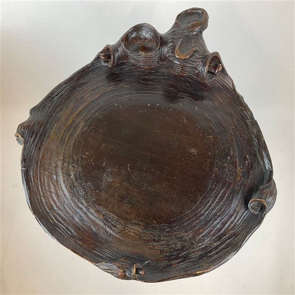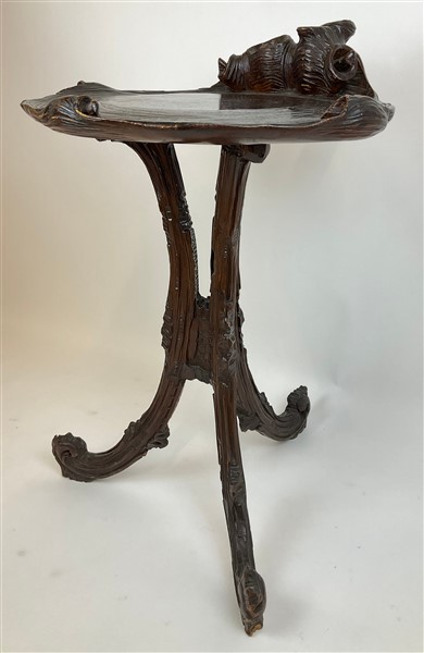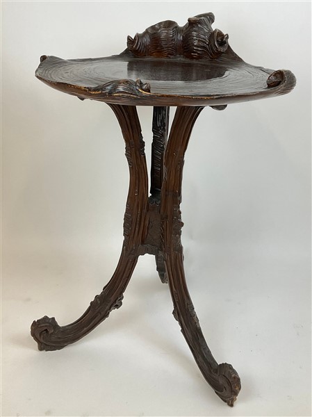 Gueridon a "grotto" in legno intagliato con piano a valva di conchiglia e sostegno tripode. Secolo XIX (d. cm 54; h. cm 80) (difetti)