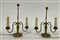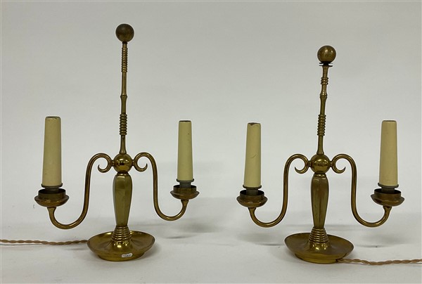 Due lampade da tavolo a due fiamme in ottone decorate a motivi torniti. Anni '5