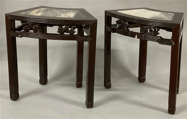 Lot 1013 | Coppia di tavolini sagomati in legno intagliato e con pianettto in marmo incass