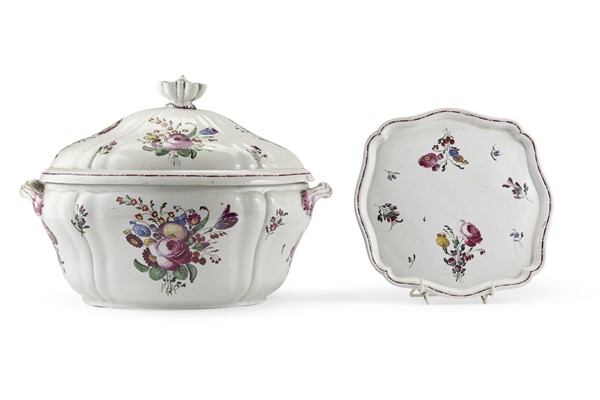 Manifattura Ginori, Doccia, secolo XVIII. Zuppiera biansata con coperchio con presa a tutto tondo in porcellana decorata in policromia a fiori (L. cm 32,5) Unita a un piatto a bordo mistilineo di stesso decoro probabilmente d'epoca posteriore (cm 21x21) (difetti e felatura alla zuppiera)