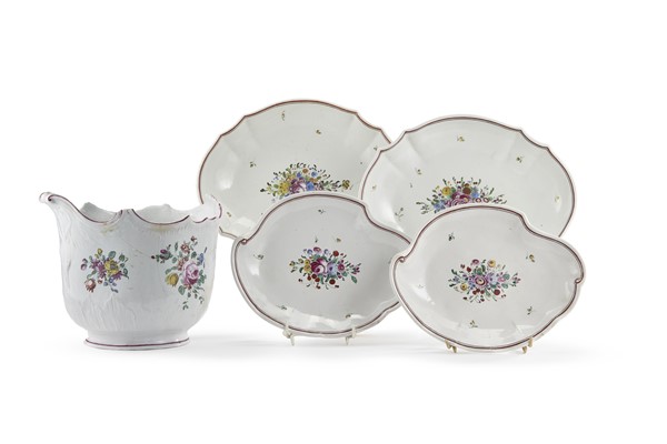 Manifattura Ginori, Doccia, fine secolo XVIII - inizio secolo XIX. Lotto composto da due marescialle, due vassoi e un cachepot a bordo mistilineo in porcellana decorata in policromia "al mazzetto" (cm max 25,5x20) (restauri)