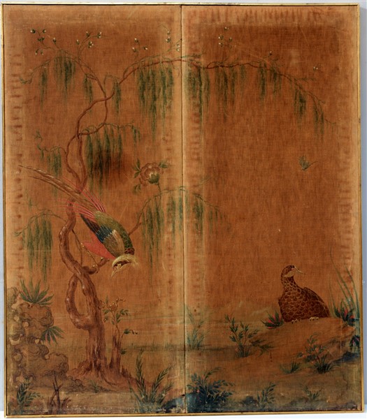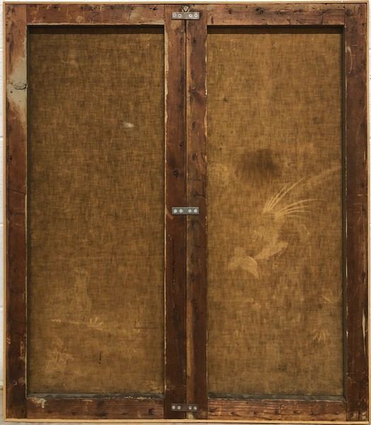 Pannello composto da due tele unite dipinte a succo d'erba raffiguranti dei volatili (cm 92x81) (difetti) ��In cornice
