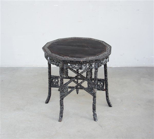 Tavolino con piano di forma dodecagonale in legno scolpito con motivi floreali