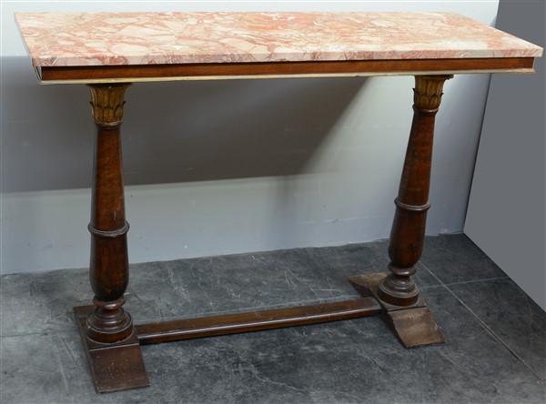 Tavolo da parete in noce di forma rettangolare con montanti a colonna tornita e capitelli dorati raccordate da traversa. Secolo XIX. Piano in marmo d'epoca posteriore (cm 120x82x40) (difetti)