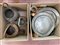Due cartoni contenenti diversi utensili e oggetti di vario uso in rame e altri metalli (difetti e mancanze)