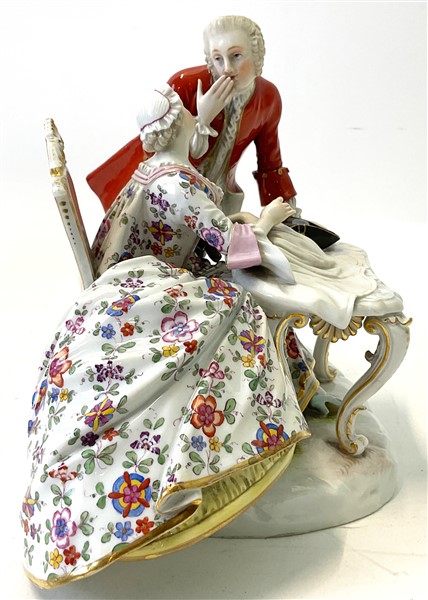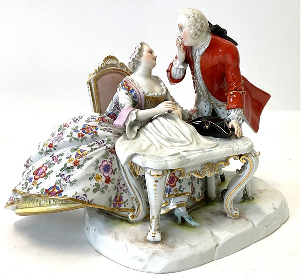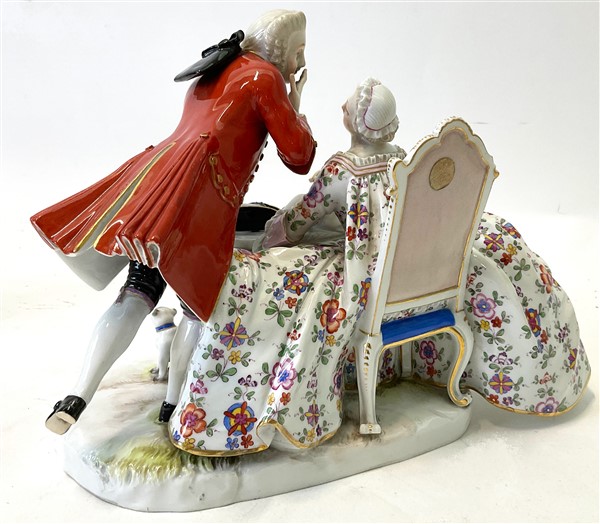 Manifattura di Meissen, secolo XIX. Scena galante, gruppo in porcellana policro