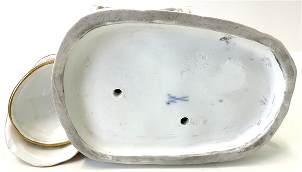 Manifattura di Meissen, fine secolo XIX. Scena galante, gruppo in porcellana policroma con profili in oro da un modello di J.J. Kandler (h cm 20) (lievi difetti)