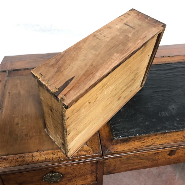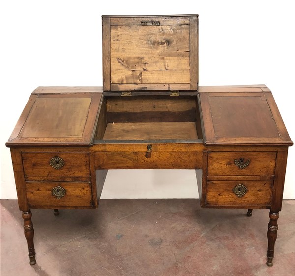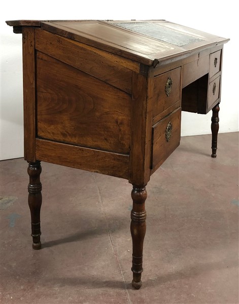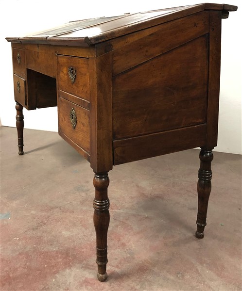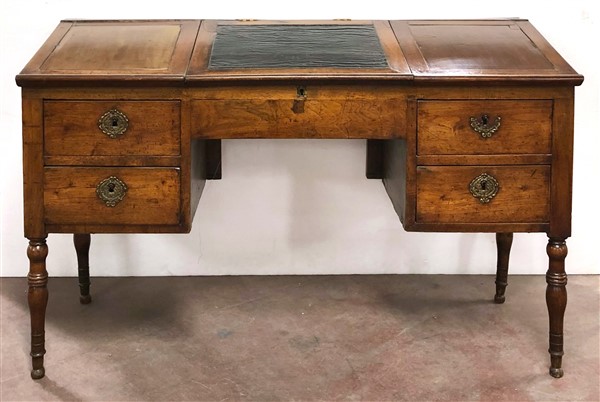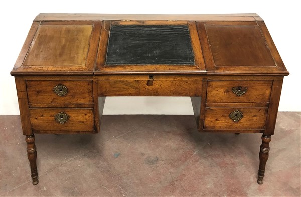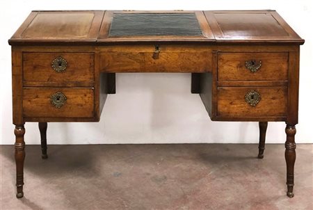 Scrittoio in legni vari con fronte a quattro cassetti, gambe tornite, piano inclinato in parte apribile con riserva in pelle (cm 130x82,5x55) (difetti)