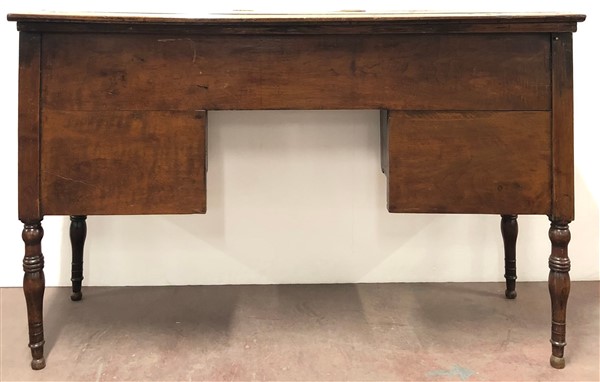Scrittoio in legni vari con fronte a quattro cassetti, gambe tornite, piano inc