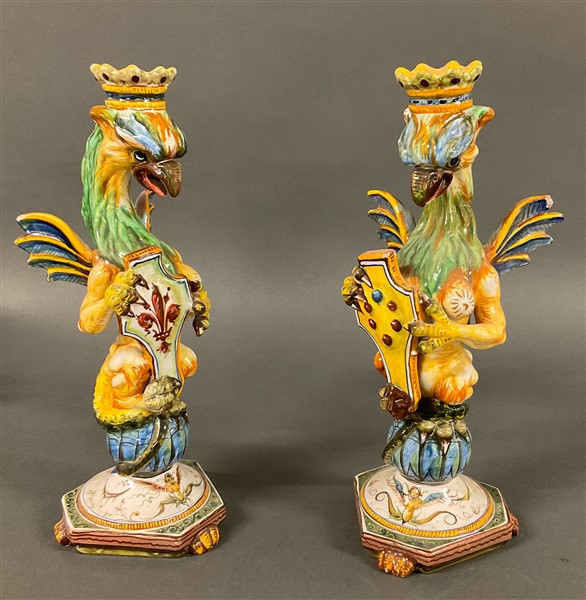 Manifattura Cantagalli, coppia di candelieri in maiolica dipinta in policromia a forma di grifoni che sorreggono lo stemma Medici, su base tripode decorata a raffaellesche (h. cm 33) (difetti)