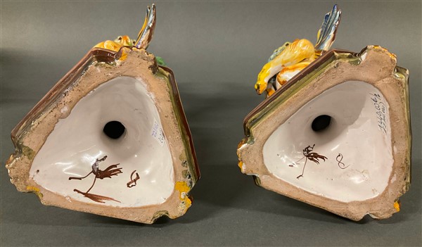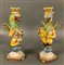 Manifattura Cantagalli, coppia di candelieri in maiolica dipinta in policromia