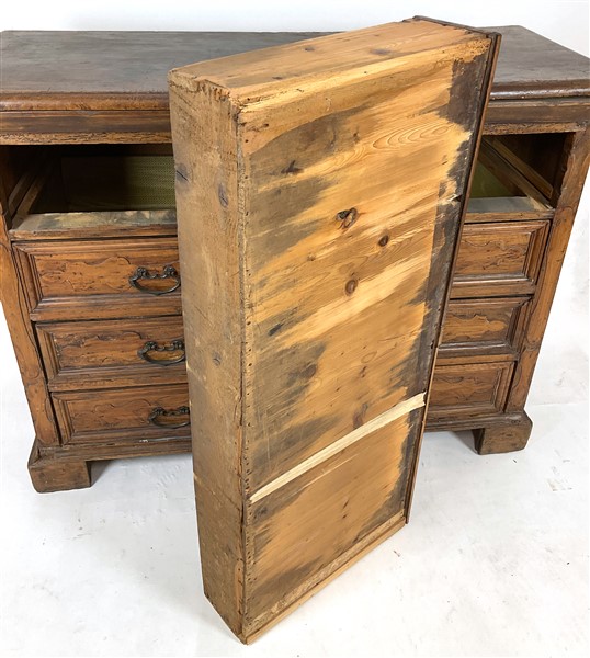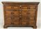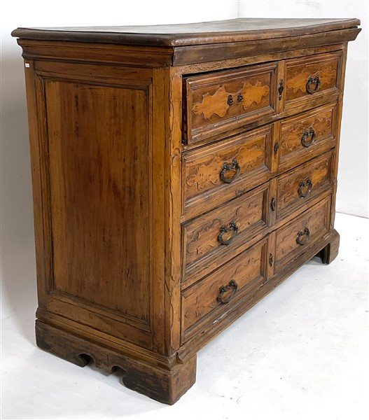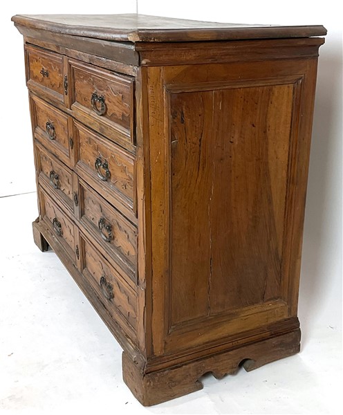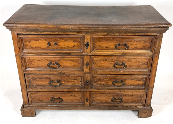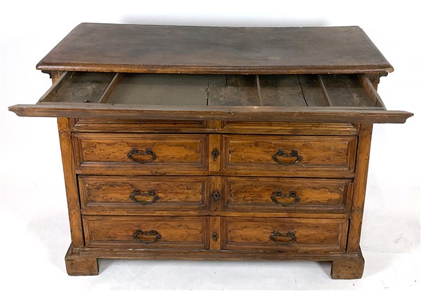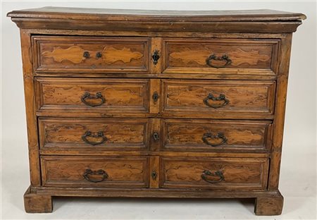 Antico cassettone a quattro cassetti centrati da cartelle sul fronte, piedi a m