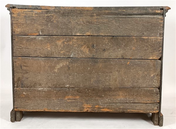 Antico cassettone a quattro cassetti centrati da cartelle sul fronte, piedi a mensola (cm 133x104x54) (difetti e restauri)