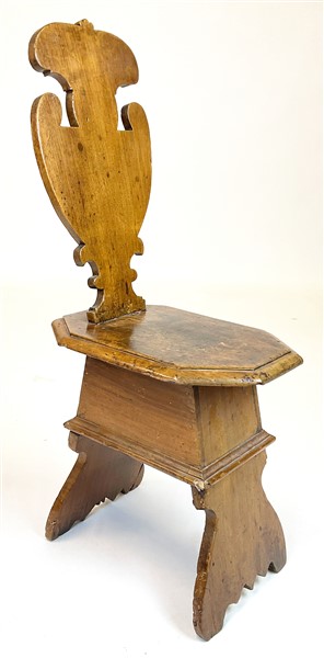 Sgabello in noce con gambe e schienale ad asso di coppe e seduta ottagonale. Se