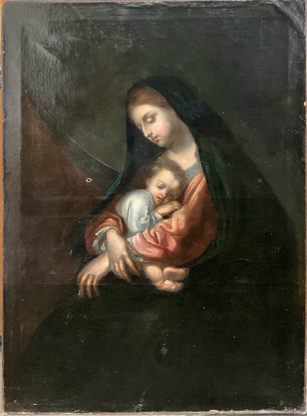 Scuola del secolo XVIII "Madonna con Bambino" olio su tela, cm 136x97 (estesi