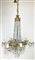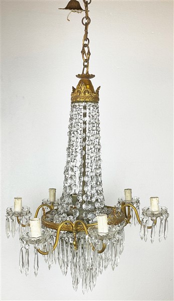 Lampadario a sei luci con pendenti in vetro e cristallo, parti in metallo dorato (h. cm 120) (difetti)