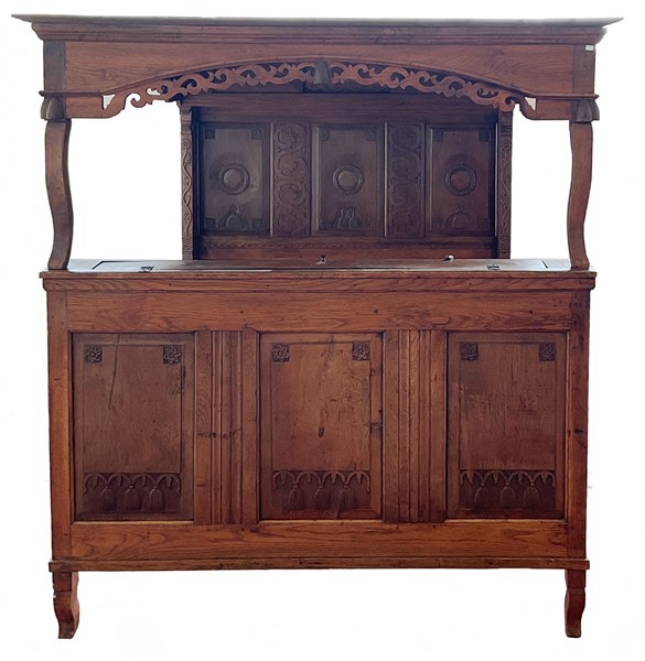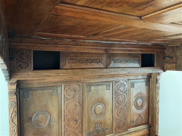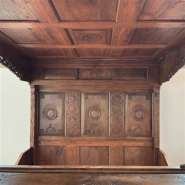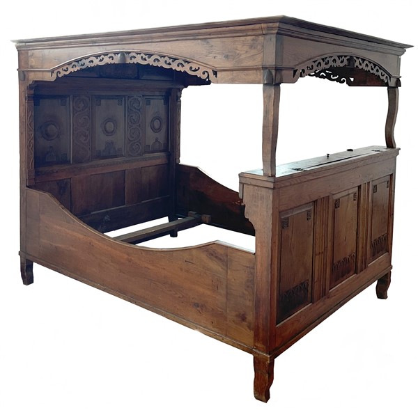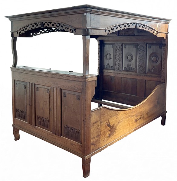 Letto a baldacchino in rovere intagliato con testiera e pediera celante vano de