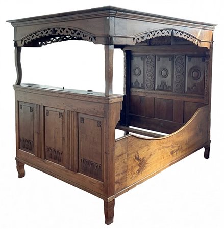 Letto a baldacchino in rovere intagliato con testiera e pediera celante vano decorati a volute di foglie e fiori. Parte superiore con cornici traforate. Francia, fine secolo XVIII (cm 162x191,5x214) (difetti)
