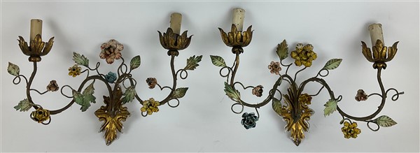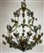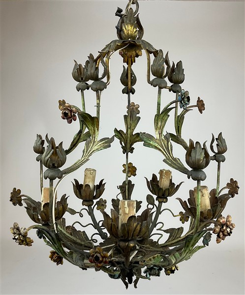 Lotto composto da un lampadario a cinque luci e coppia di applique a tre luci in metallo dipinto a motivi floreali (h. cm 54) (difetti)