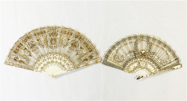 Arte del secolo XIX. Lotto di due ventagli con stecche in osso e madreperla incise, traforate, dipinte e dorate con pagine in pizzo e tessuto dipinte con decoro a volute e motivo floreale (difetti)