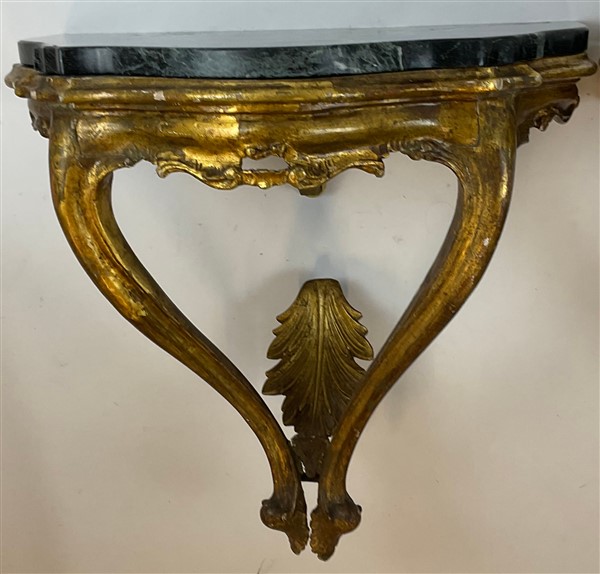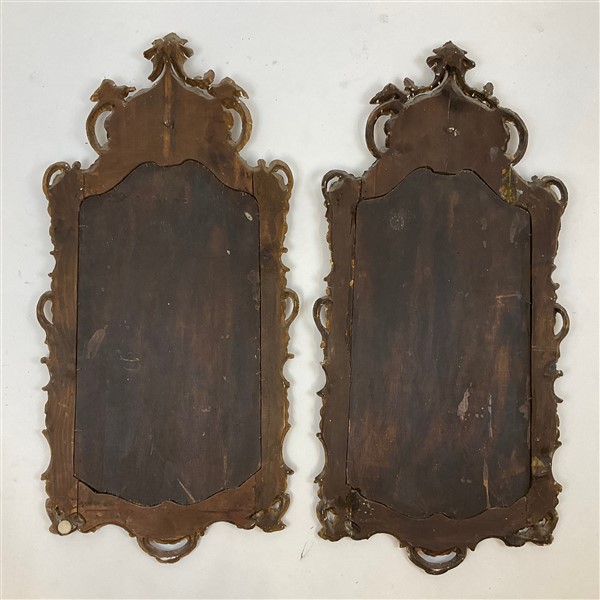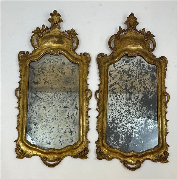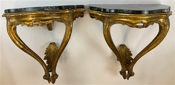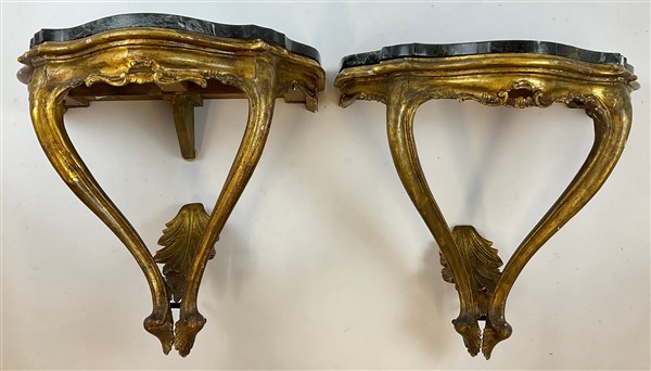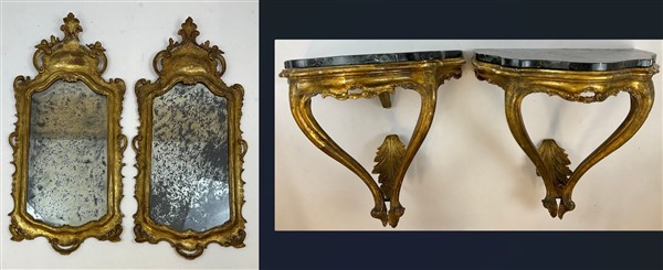 Lotto composto da coppia di specchiere e coppia di console ad applique in legno e stucco dorati in stile settecentesco, piani in marmo (specchiere: cm 103x46; console: cm 59x56) (difetti e mancanze)