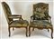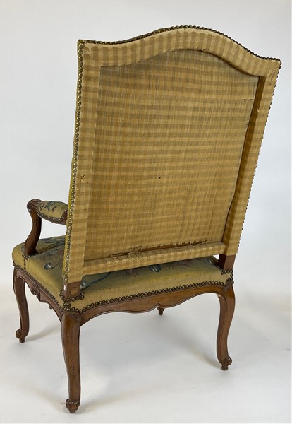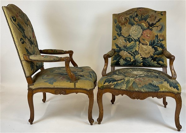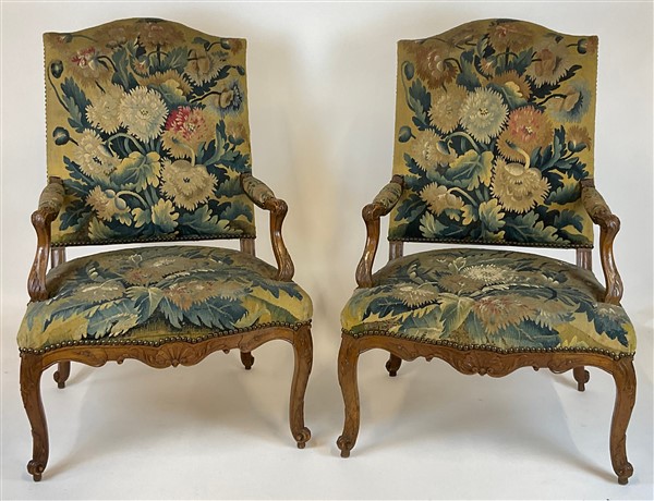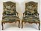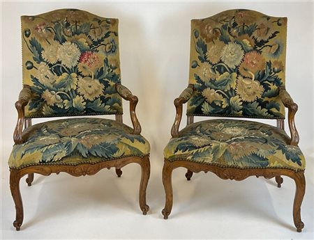 Coppia di poltrone in noce intagliato con braccioli e gambe mosse, rivestimento in tessuto ad arazzo, Francia, secolo XVIII (lievi difetti)