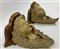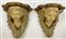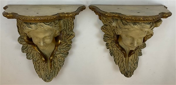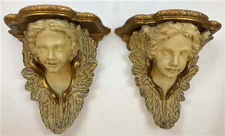Coppia di mensole in legno e stucco dipinto e dorato in foggia di testa di ange