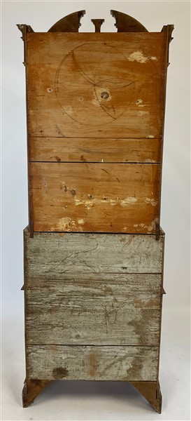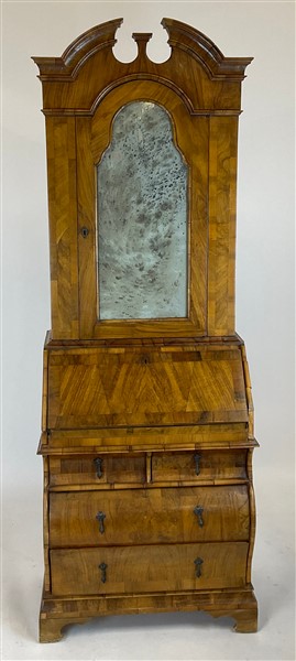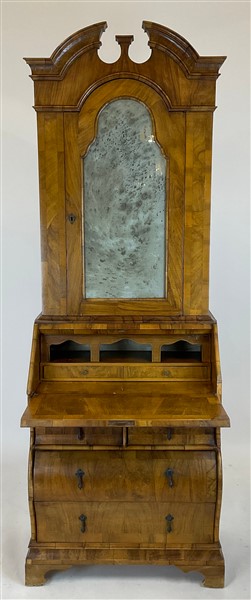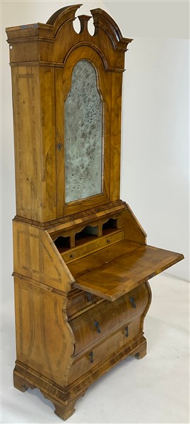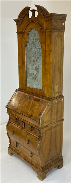 Trumeau lastronato in noce, parte inferiore a due cassetti e due tiretti sotto calatoia, parte superiore ad un'anta a specchio, cimasa a timpano spezzato (cm 68x193) (difetti e mancanze)