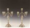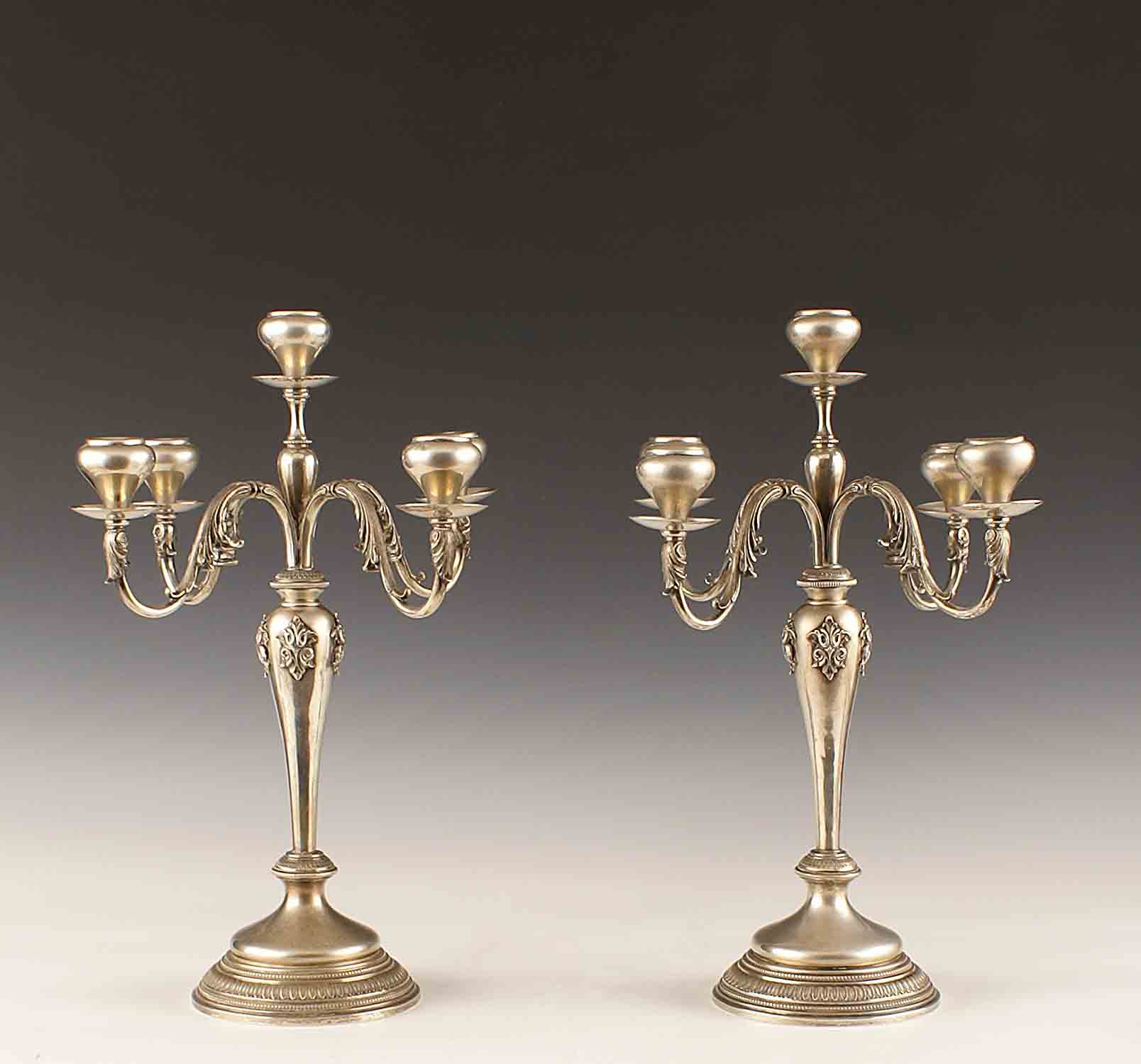 Coppia di candelieri in argento a cinque fiamme, decorati a motivo di foglie...