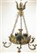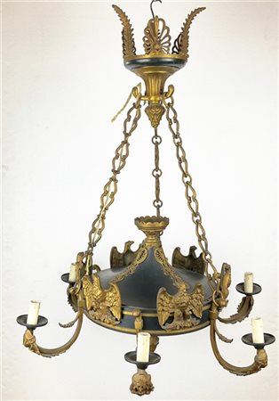 Lampadario in bronzo brunito e dorato a sei luci, bracci con decori a volti muliebri, finali a foggia di pigna e fregi ad aquile a rilievo. Secolo XX (h. cm 92) (difetti)