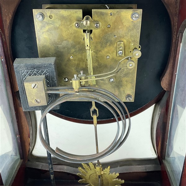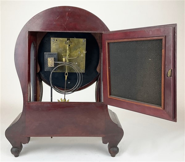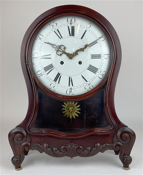 Orologio con cassa di forma mossa in legno intagliato a volute. Quadrante in smalto bianco a numeri romani per le ore, arabi per i minuti. Movimento a due treni con suoneria delle ore e mezze. Secolo XX (h. cm 50) (difetti)